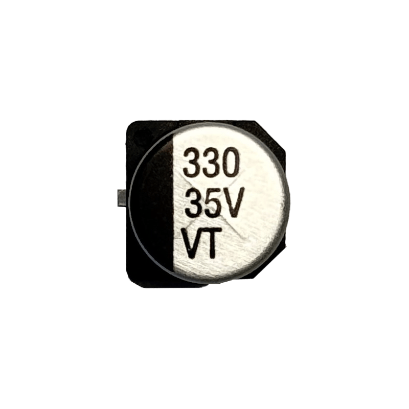 Compact and reliable 330µF 35V SMD electrolytic capacitor designed for power filtering and smoothing in electronic circuits, offering stable performance across a wide temperature range.