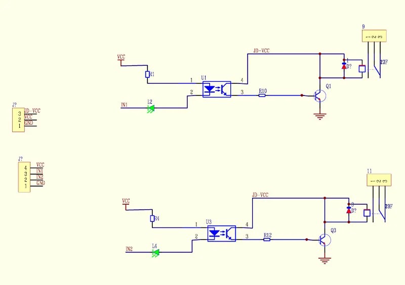 The second is that the input is active low, meaning that the relay coil is activated only when the input is low. This is because the optocoupler input and the indicator LED are chained to VCC. When the input is high, the voltage difference across the chain is 0V and no current can flow, but when the input is low, supply voltage appears across the chain and the optocoupler output conducts, supplying current to the base of the drive transistor, turning the relay on.