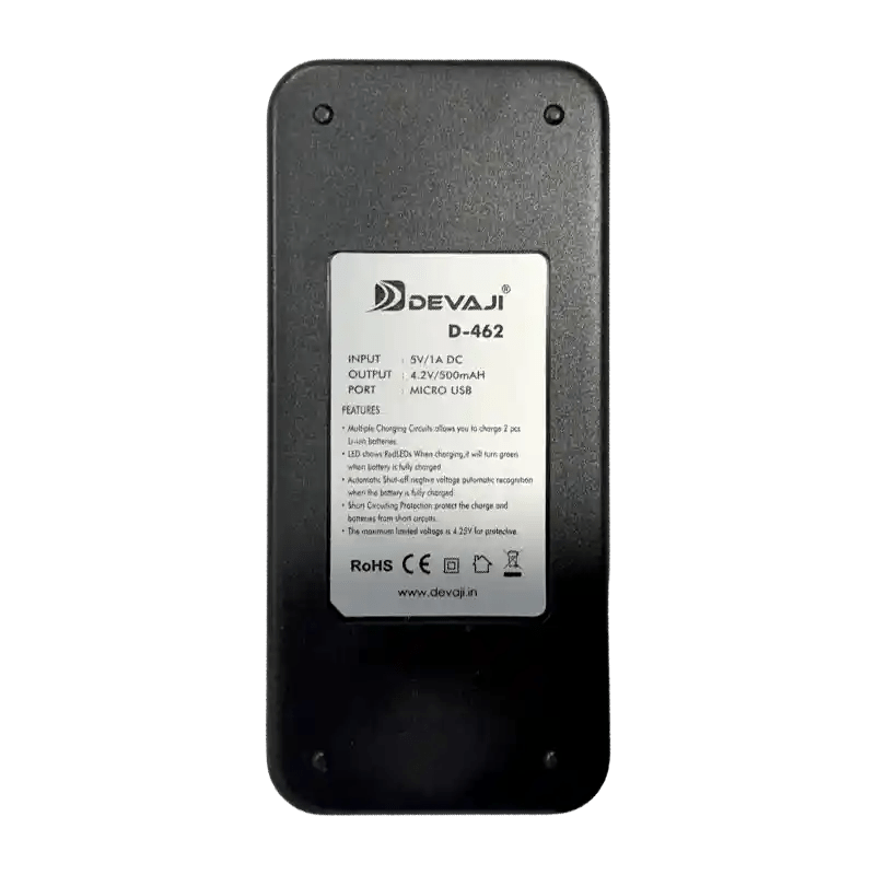 The DEVAJI Standard Dual Slot Charger is designed for 3.7V Li-ion rechargeable batteries, offering fast and safe charging for devices like cameras, flashlights, and toy cars. With dual-slot support, smart LED indicators, and built-in safety features, it ensures reliable performance and extended battery life.